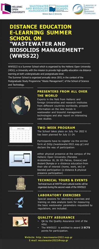 We are delighted to welcome participants to attend the 7th distance education e-learning International Summer School and Workshop on “Wastewater and Biosolids Management” (WWSS22), taking place in Patras, Greece, July 11 – 24, 2022; a scientific event organized in the context of the Postgraduate Study Program “Waste Management”, by the Hellenic Open University (HOU).